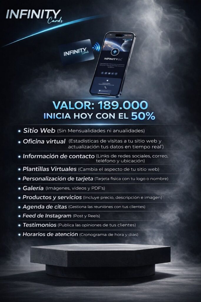 Infinity card es una tarjeta inteligente que utiliza tecnología NFC para compartir información de manera instantánea sin necesidad de contacto físico. Puedes compartir tu perfil profesional o personal con solo acercar la tarjeta a un smartphone.